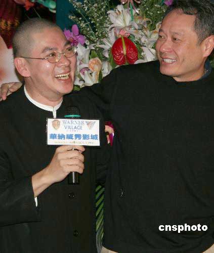 獲柏林電影節銀熊獎的影片《天邊一朵云》在全臺公映。該片因有暴露的性愛鏡頭而引起一些爭議。圖為3月18日晚,曾獲奧斯卡獎的名導演李安(右)在臺北出席該片首映式時,與該片導演蔡明亮相見甚歡。作者:董會峰