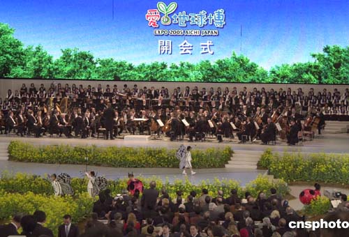 隨著日本皇太子德仁按下世博會啟動按鈕,會場中飄起了畫著眼睛的紙片,愛知世博會在“讓我們心連心”的歌曲大合唱中正式開始。開幕式慶典即進入第二部分,由近百名世界知名音樂家組成的“世博超級全球管弦樂團”為觀眾演奏了霍爾斯特的《行星》組曲之《木星》;肖邦的《夜曲》和斯特拉文斯基的《火鳥》。