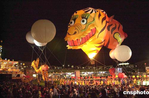 日本愛知世博會三月二十五日開展。當晚,在世博廣場舉行慶祝表演“生命的節日”,一個巨大的虎形熱氣球款款升空,場面頗為壯觀。作者:王健