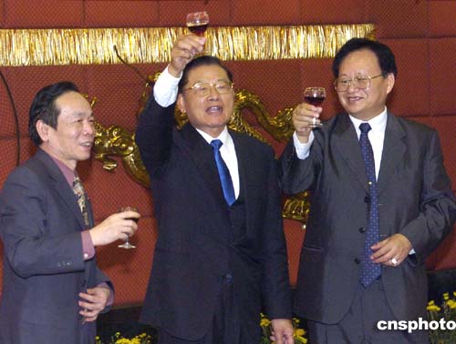 三月二十九日,中國國民黨副主席江丙坤(中)率領的國民黨高層大陸參訪團一行在廣州接受廣東臺商宴請。作者:羅仰明