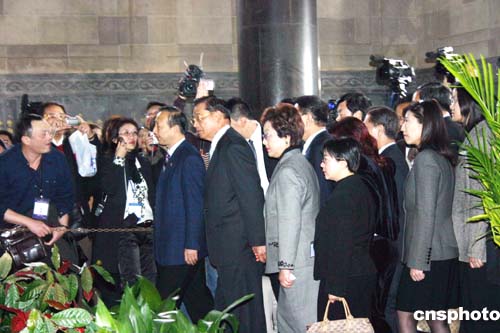 三月三十日上午九點,國民黨參訪團拜謁中山陵的祭拜儀式正式開始。江丙坤代表中國國民黨主席連戰及全體國民黨黨員向中山陵敬獻花籃。參訪團所有成員均向孫中山遺像三鞠躬并默哀一分種。圖為參訪團所有成員在孫中山陵寢旁繞場一周,瞻仰孫中山遺像。作者:陳旻