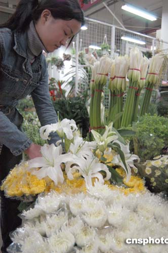 清明節前北京鮮花市場需求激增,每天約有十萬枝黃白色菊花、白百合和馬蹄蓮等素色鮮花由產地運來京城,以供北京清明祭掃之需。作者:徐曦弋