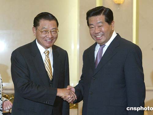 三月三十一日,中共中央政治局常委、全國政協主席賈慶林在北京人民大會堂會見中國國民黨副主席江丙坤。作者:廖文靜