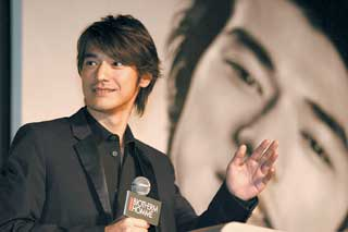 昨天的發(fā)布會(huì)設(shè)在劇場(chǎng)里面,舞臺(tái)兩邊早已掛起金城武最新拍攝的兩張碩大海報(bào),一張溫文爾雅,一張則性感十足。當(dāng)金城武出現(xiàn)時(shí),先是全場(chǎng)一片漆黑,然后又是一陣強(qiáng)光和一團(tuán)煙霧,他一個(gè)人孤零零地站在寬大舞臺(tái)上接受著下面的驚聲尖叫,這種架勢(shì)持續(xù)了好幾分鐘,使得他不好意思地站起身來,一會(huì)兒摸摸腦袋,一會(huì)兒又把手插進(jìn)褲袋。而當(dāng)主持人不斷向他拋來“你簡(jiǎn)直驚若天人”、“你身上有卓然不同的男人氣質(zhì)”等贊美之語時(shí),他雙手緊握著麥克風(fēng),不斷彎腰說謝謝。當(dāng)主持人問他喜歡現(xiàn)場(chǎng)掛的哪張廣告照片時(shí),金城武謙虛地說:“不要再夸我了,其實(shí)突然看見這么大一張自己的臉,我覺得很別扭。”