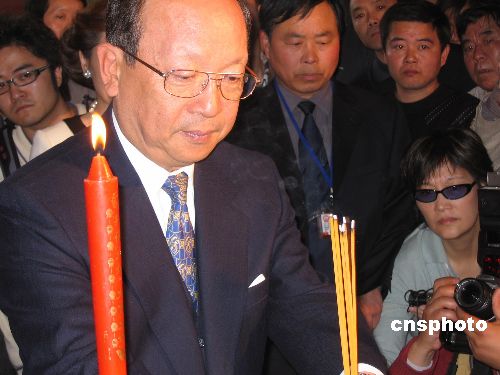 蔣孝嚴肅然而立,接著,上香,跪拜,臉龐上輕快的笑容隨著祭拜儀式的開始而慢慢凝重。他的身邊,是夫人蔣黃美倫。
