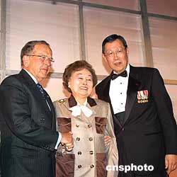 四月七日,正在華盛頓舉行的美國知名華裔團體百人會年會,為著名的美籍華人社會活動家陳香梅頒獎,表彰她為促進美中關系所做出的貢獻。這是美國退役將軍傅履仁(右)和美國會議員史蒂文斯(左)祝賀陳香梅獲獎。作者:譚宏偉