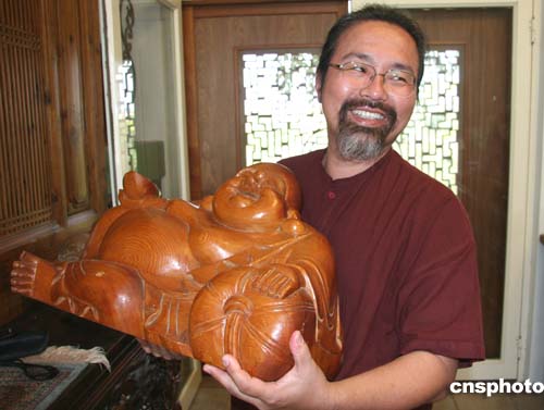 臺灣花蓮市古玩具店“畬歆閣”老板方永清,近日向中新社記者展示他收藏的三義木雕精品彌勒臥佛。苗栗縣三義鄉(xiāng)是木雕重鎮(zhèn),三分之一人口從事木雕業(yè),產(chǎn)品獨步臺灣全島。作者:董會峰