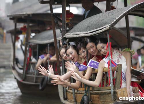 二零零五年國際旅游小姐中國區總決賽的選手,四月十七日游覽千年古鎮西塘,為春日的古鎮增添艷麗色彩。作者:毛建軍