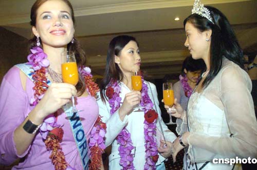 由鳳凰衛視組織的“鳳凰有約——情系印度尼西亞送愛心”赴印度尼西亞親善訪問團,4月17至20日在印度尼西亞展開災區親善探訪活動。圖為2004年世界小姐Miss Maria Garcia Mantilla (左)、2004年中華小姐李詩琪(中)與印度尼西亞小姐一起為災區送愛心。作者:洪少葵