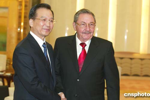 中國國務院總理溫家寶四月十八日在北京會見了古共中央第二書記、國務委員會第一副主席兼部長會議第一副主席勞爾·卡斯特羅。作者:滿會喬