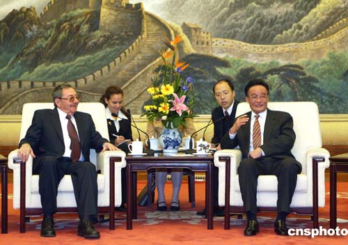 四月十九日,全國(guó)人大常委會(huì)委員長(zhǎng)吳邦國(guó)在北京會(huì)見(jiàn)了古巴共產(chǎn)黨中央第二書(shū)記、國(guó)務(wù)委員會(huì)第一副主席兼部長(zhǎng)會(huì)議第一副主席勞爾·卡斯特羅。作者:廖文靜