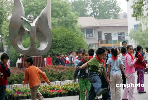 陜西西安后宰門小學的學生們在上課前做游戲。這所小學的前身是中國國民黨主席連戰先生小學時的母校。四月三十日,來大陸訪問的中國國民黨主連戰將來此造訪。作者:武仲林