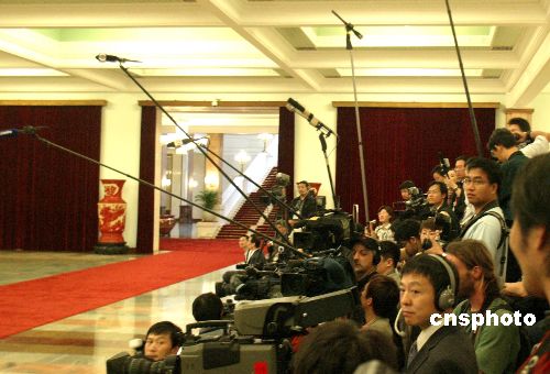 四月二十九日下午,中共中央總書記胡錦濤在北京會見中國國民黨主席連戰。大批海內外媒體記者云集人民大會堂見證這一歷史時刻。作者:廖文靜
