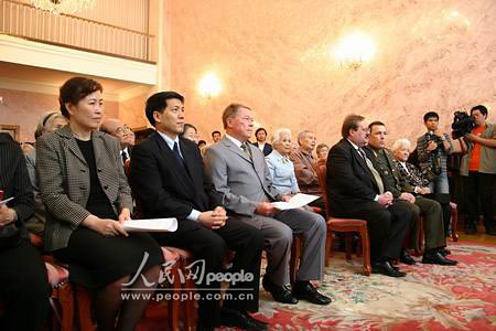 中新網(wǎng)4月30日電 俄羅斯駐中國大使羅高壽29日向?yàn)樘K聯(lián)衛(wèi)國戰(zhàn)爭做出貢獻(xiàn)的27名中國人頒發(fā)了“1941-1945年偉大衛(wèi)國戰(zhàn)爭勝利60周年”紀(jì)念章。獲得紀(jì)念章的27人包括:毛澤東之子毛岸青、劉少奇之女劉愛琴、朱德之女朱敏等。