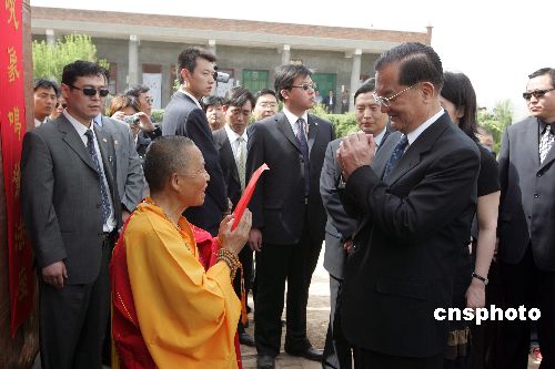 五月一日上午,中國國民黨主席連戰率家人在西安清涼寺祭掃祖母墓,實現六十年來首次回來祭掃祖母墓的愿望。圖為連戰祭拜祖母墓后與中國國民黨大陸訪問團成員一起到清涼寺上香,并向住持送上香油錢。作者:毛建軍