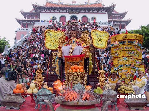 中新社莆田五月一日電(記者王東明)五月一日(農歷三月二十三)是聞名海內外的海上和平女神媽祖誕辰一千零四十五周年紀念日。以“海峽兩岸同謁媽祖,中華兒女共享平安”為主題的紀念媽祖誕辰系列活動在媽祖文化的發源地福建莆田湄洲島隆重舉行。四十八個臺灣媽祖文化機構,上千名海內外媽祖信眾前來拜祭。