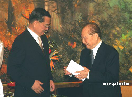 連戰(zhàn)首先對(duì)汪老說,“今天是向汪老來請(qǐng)安問候的”。汪老表示,感謝連戰(zhàn)等在緊促的行程中來看望他。