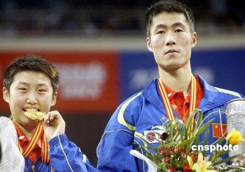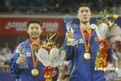 第四十八屆世界乒乓球錦標賽混合雙打的比賽五月四日晚在上海體育館進行,中國選手包攬了前三名,王勵勤、郭躍奪得冠軍。作者:盛佳鵬