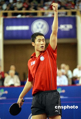 中新社上海五月六日電 (記者 王歡)世界排名第一的中國選手王勵勤在今天舉行的第四十八屆世界乒乓球錦標賽男子單打決賽中,以四比二擊敗隊友馬琳,奪取了這枚“含金量”最足的金牌,這也是中國隊在世乒賽歷史上第十三次奪得男子單打冠軍。