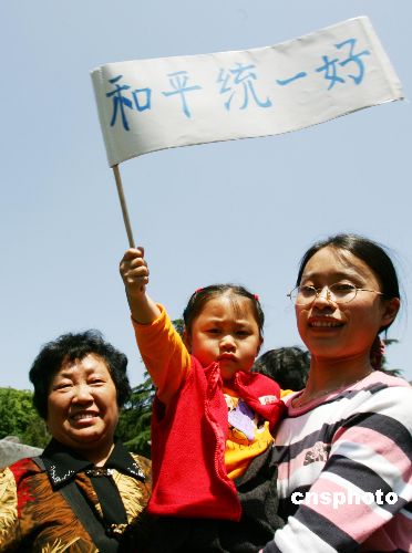 5月7日,一位小游客舉著“和平統一好”的字幅,歡迎親民黨主席宋楚瑜的到來。當日上午,親民黨主席宋楚瑜率領親民黨大陸訪問團拜謁南京中山陵。作者:郎從柳