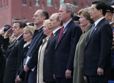 獻(xiàn)花結(jié)束以后,各國領(lǐng)導(dǎo)人在一旁的小廣場集體合影,接著出席普京總統(tǒng)在克里姆林宮大會堂六層宴會廳舉行的紀(jì)念衛(wèi)國戰(zhàn)爭勝利六十周年宴會。
