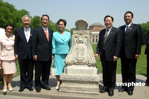 五月十一日上午,親民黨主席宋楚瑜在清華大學發表演講。之后,親民黨主席宋楚瑜和夫人等參觀了清華大學的主要景點和經典建筑,并與中臺辦主任陳云林(右一)、清華大學校長顧秉林(右二)在日晷前合影。作者:張勤