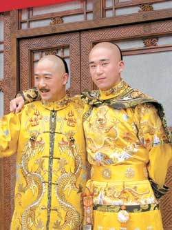 《飛龍倚天游》和《龍非龍鳳非鳳》兩部古裝戲昨天在橫店同時(shí)對(duì)媒體開放。雖然是兩個(gè)各自獨(dú)立的劇組,但兩部戲方方面面千絲萬(wàn)縷的聯(lián)系起初仍搞得記者們一頭霧水。首先,兩部戲都是亦莊亦諧風(fēng)格的情節(jié)劇,故事又都發(fā)生在清朝,而且除了張國(guó)立父子同上陣外,鄧婕還在《龍非龍鳳非鳳》中扮演慈禧并擔(dān)任總制片人。更復(fù)雜的是張國(guó)立及張默、王剛、臺(tái)灣演員鄭家榆等又在兩部戲中分別出演不同角色,搞得兩部戲之間的聯(lián)系更為復(fù)雜。