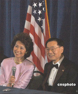 當地時間五月十四日,二00五年度美國愛利斯島移民榮譽獎頒獎典禮隆重舉行。美國勞工部部長趙小蘭和父親趙錫成—美國福貿(航運)集團董事長、著名偵探李昌鈺、美國華人進口貿易協會主席蘇夢娜、大紐約小商家聯盟主席謝美琳等五位華人榜上有名。圖為趙家父女一同接受記者采訪。作者:譚宏偉