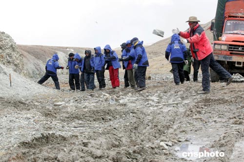 二零零五年五月十三日,穿越可可西里聯想鋒行探險隊傳遞石頭,為陷車的八噸大卡墊路。