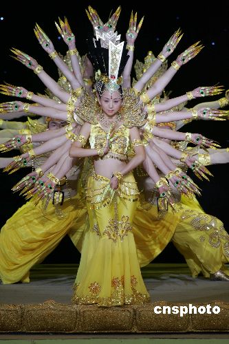 五月十九日,二零零五年日本愛知世屆博覽會中國館日活動隆重舉行。二零零五年日本愛知世博會中國館主題為“自然、城市、和諧--生活的藝術”,中國館的展出通過博大精深的中國文化的演繹,表達了中國人“天人合一”的哲學思想。圖為中國殘疾人藝術團表演的舞蹈“千手觀音”為中國館日增色。作者:毛建軍