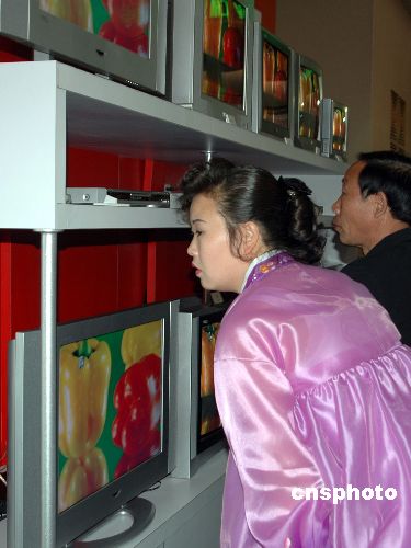 由朝鮮貿易省主辦的“第八屆平壤國際商品博覽會”五月十六日至十九日在朝鮮平壤三大革命展示館舉行,有來自世界各國的三百多家企業參展,這是朝鮮歷史上首次舉辦大規模的國際商務活動。圖為朝鮮人參觀中國生產的液晶電視展臺。作者:涵喬