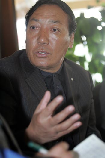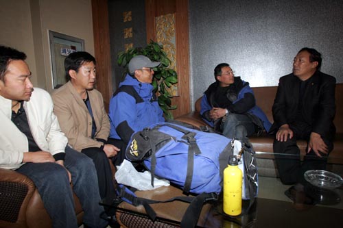 穿越可可西里聯想鋒行探險隊向可可西里國家級自然保護區管理局捐贈兩臺聯想電腦。圖為可可西里國家級自然保護區管理局局長才嘎在西寧小天鵝賓館探望此間下榻的探險隊員。
