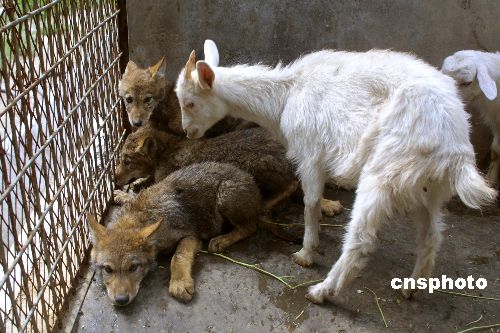 烏魯木齊動物園內三只小灰狼和五只可愛的小山羊共處一室,和諧共處,吸引眾多游客前來一探究竟。這些小家伙都由山羊媽媽的奶水喂養長大,兩個多月的嬉戲玩耍使它們難舍難分,令飼養員在它們斷奶后仍不忍心將它們分開。作者:劉新