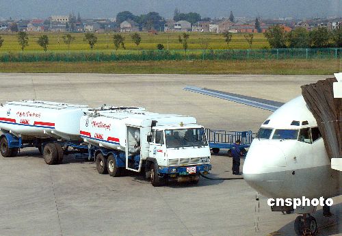 2005年6月3日,據(jù)民航總局披露,中國三大航空公司——國航、東航、南航提出的在機(jī)票中增加燃油附加費(fèi)的申請(qǐng)被有關(guān)部門正式駁回。上月中旬,國航、東航、南航三大航空巨頭共同向國家發(fā)改委申請(qǐng)了征收約占機(jī)票價(jià)格10%的燃油附加費(fèi)。民航總局有關(guān)負(fù)責(zé)人表示,盡管目前燃油價(jià)格居高不下,但由于2004年4月份《民航國內(nèi)航空運(yùn)輸價(jià)格改革方案》中已經(jīng)明文取消了燃油附加費(fèi),因此三大航空公司的申請(qǐng)不被接受。圖為寧波櫟社機(jī)場(chǎng)一輛加油車正在為飛機(jī)加油。作者:張和平