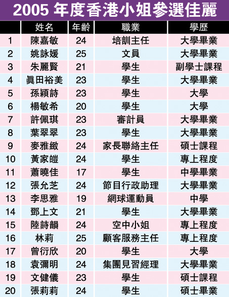 中新網(wǎng)6月7日電 據(jù)香港媒體報道,《2005年度香港小姐競選》二十位候選佳麗將于下周一起程到南亞海嘯災區(qū)探訪,昨日一班佳麗經(jīng)過大會連日來“改頭換面”,首次正式會見傳媒。今屆參選的佳麗學歷俱十分高,大部分佳麗皆擁有大學程度,其中9號麥雅致、19號文健儀和20號張莉莉更持有碩士學位。不過佳麗們的平均年齡亦直線上升,有九位佳麗年齡更在24歲以上,接近參選的年齡上限。