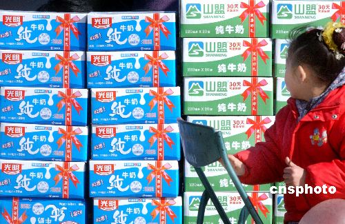 河南媒體近日報道了鄭州光明山盟乳業有限公司“變質光明牛奶返廠加工再銷售”一事。對此,鄭州光明山盟的控股方——光明乳業股份有限公司當日發布了“誠告消費者書”,稱“鄭州光明山盟從來沒有做過‘將變質牛奶返廠加工再銷售’的行為”,但也坦承光明在管理上存在疏漏。圖為2005年3月13日鄭州街頭促銷的光明純牛奶和光明山盟純牛奶。作者:馬健