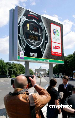 6月9日,在德國柏林街頭,2006世界杯倒計時牌與勃蘭登堡門遙相呼應,德國世界杯前一年倒計時活動已經正式拉開帷幕。作者:Ic/cnsphoto