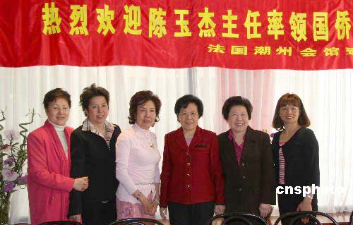 當地時間6月9日,國務院僑辦主任陳玉杰一行繼英國、意大利之后到訪法國,開始其歐洲之行的第三站也是最后一站的宣慰僑胞之旅。陳主任在法國潮洲會館參觀了華文學校,并同部分法國僑領舉行了座談。座談結束后,僑胞紛紛與陳玉杰主任合影。圖為陳玉杰主任(右三)和僑辦國外司副司長朱慧玲(右一)與潮洲會館的女僑領們在一起合影。作者:鐘誠