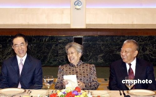 6月13日,國家副總理吳儀與全國政協副主席董建華(右)及香港署理行政長官唐英年(左)出席太平洋地區經濟理事會開幕主題演講午餐宴會。作者:洪少葵