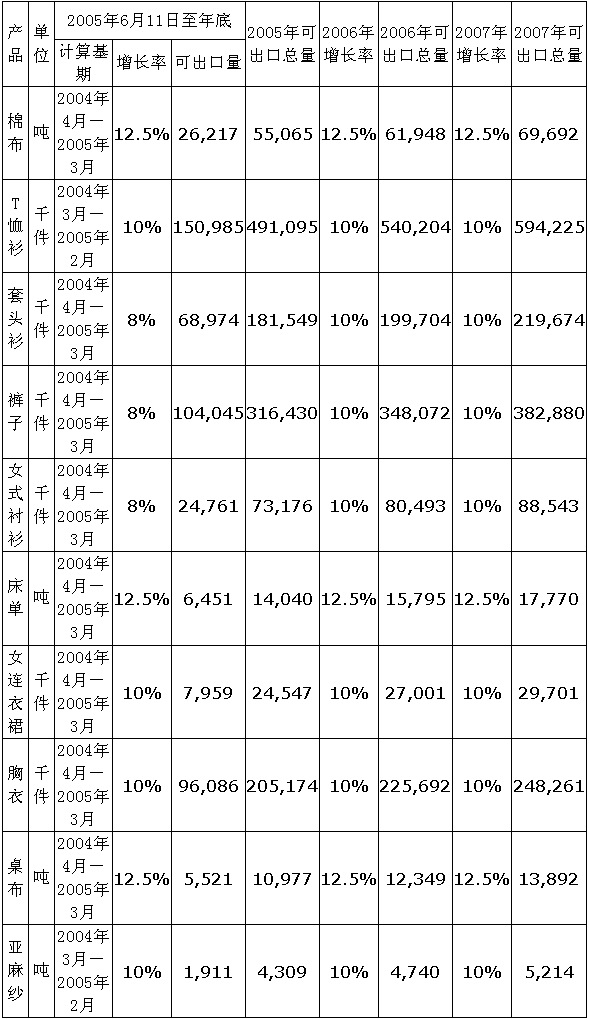 2005—2007年輸歐10類紡織品出口數(shù)量安排表