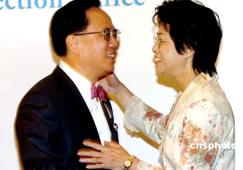 曾蔭權(quán)在16日晚的記者會(huì)上與夫人相擁祝賀。