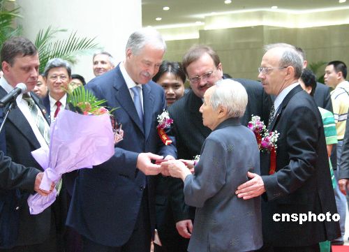 六月十八日,俄羅斯國家杜馬主席格雷茲洛夫出席了重慶市直轄八周年紀念活動和《紀念二戰勝利六十周年圖片展》開幕式,并參觀了蘇軍烈士紀念墓和原蘇聯大使館重慶舊址。圖為格雷茲洛夫(左二)向東北抗日聯軍老戰士胡真一女士(右二)頒發“偉大的衛國戰爭勝利六十周年紀念章”。作者:郭晉嘉