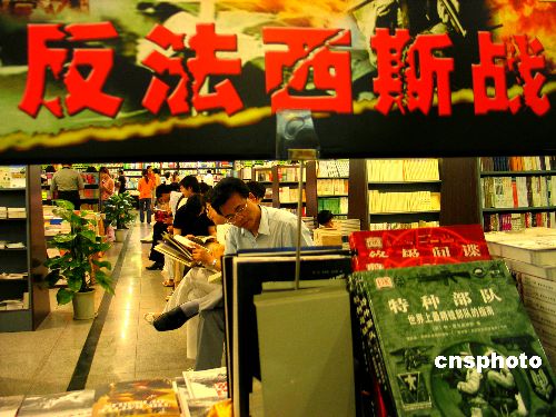 6月18日,南京某書城為紀(jì)念中國抗日戰(zhàn)爭暨世界反法西斯戰(zhàn)爭勝利60周年,在店堂內(nèi)設(shè)立了反法西斯戰(zhàn)爭主題書展,受到讀者歡迎,每天都吸引百余位讀者。作者:鐘山