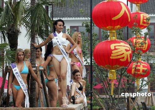 六月二十二日,參加二零零五年國際旅游小姐大賽的佳麗們身著泳裝在水鄉周莊亮相拍照。作者:毛建軍