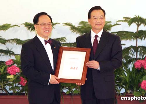 香港特區行政長官曾蔭權六月二十四日在北京人民大會堂香港廳宣誓就職,國務院總理溫家寶向曾蔭權頒發任命書。作者:毛建軍