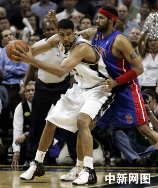 底特律活塞隊拉希德-華萊士從后方奮力圍攔圣安東尼奧馬刺隊的年度最有價值隊員蒂姆·鄧肯。這是6月23日在德克薩斯舉行的NBA決賽第七場現場。馬刺隊最終以81-74贏得了這場比賽。