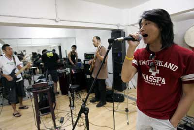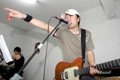 傍晚時分,記者在北新橋附近的排練廳見到了高旗。高旗將在演出中演唱兩首歌曲:改編自電影《寧死不屈》的插曲和他自己的《陳勝吳廣》。高旗改編后的《寧死不屈》插曲融入了很強的重金屬味道。(王菲)