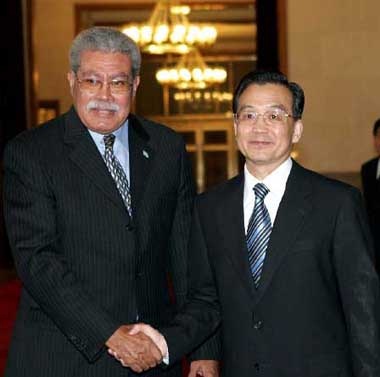 中新網6月30日電 據中國外交部消息,6月29日,國務院總理溫家寶在人民大會堂與斐濟總理恩加拉塞舉行會談,雙方就雙邊關系和地區合作問題交換了意見并達成共識。