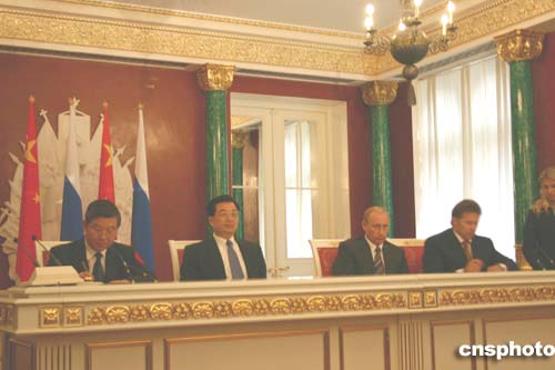 中國和俄羅斯企業界今天在此間簽署多項協議,涉及石油天然氣、電力以及金融等諸多領域。正在對俄羅斯進行國事訪問的中國國家主席胡錦濤與俄總統普京共同出席了簽字儀式。圖為中國石油天然氣集團公司總經理陳耕與俄羅斯石油公司總裁波格丹諾夫簽署了《長期合作協議》。作者:齊彬