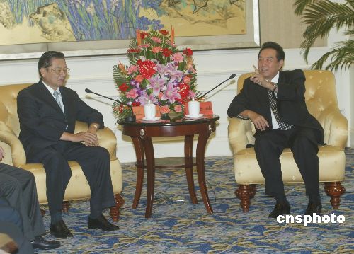七月五日,中共中央臺辦主任陳云林在北京飯店會見臺灣華聚產業共同標準推進基金會董事長江丙坤。江炳坤率臺灣方面五十三人參加“海峽兩岸信息產業技術標準論壇”。作者:史利